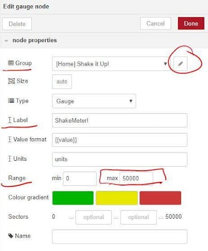 - Configure it: Set Range 0–50000 (no comma—write it as 50000), Label “ShakeMeter!”, Units “units,” and Group “[Home] Shake it Up!” If the group doesn’t exist, create it: click edit next to “Group,” then “Tab,” set Tab as “Home,” Width 12, then Update and Done.