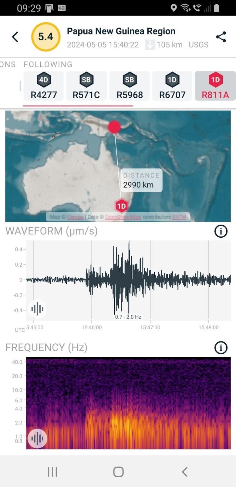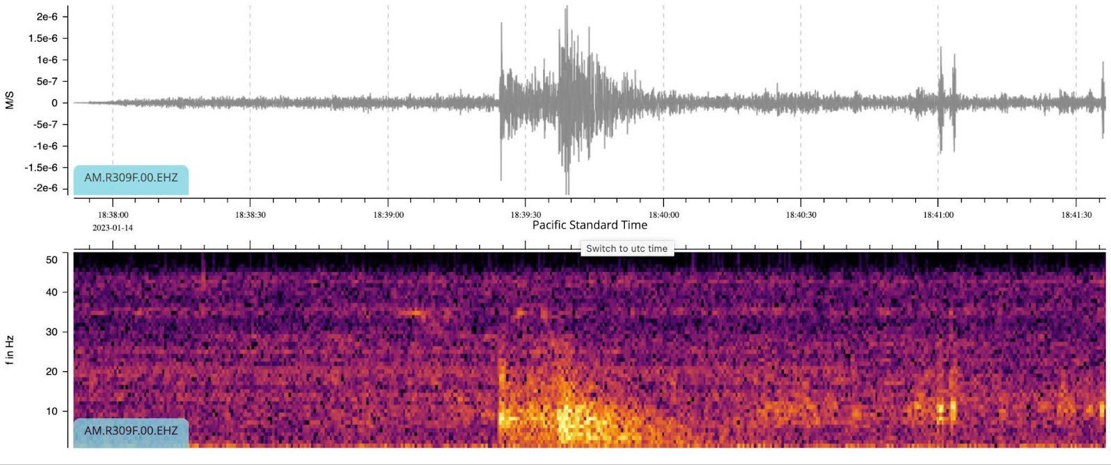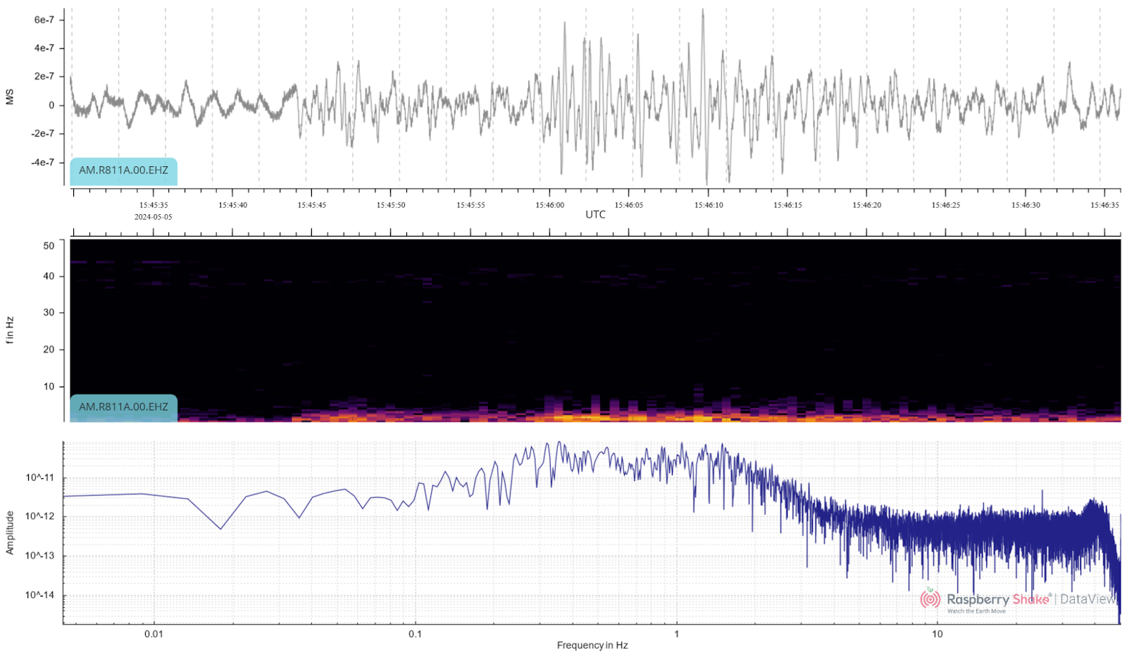 - The helicorder trace is low frequency (<5 Hz), and you can see the discrete up/down excursions rather than a more general “fuzz” that would be typical of a human-caused trace and higher frequency on the frequency display;