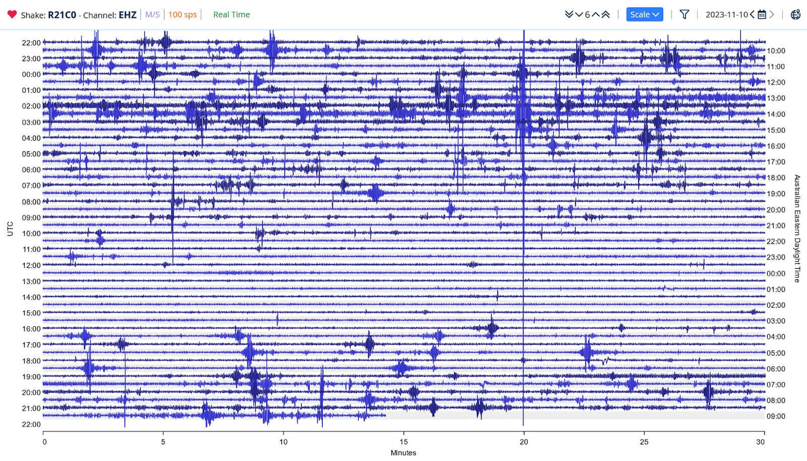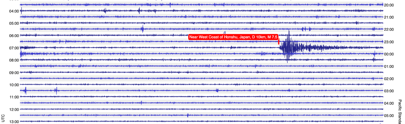This becomes more pronounced the closer you are to civilization. Heavy traffic, railroads, building work, demolition, and many other things shake the earth, and those vibrations affect seismometers for many miles around. Perhaps the most important of the natural causes of diurnal variation is wind. Often, there is more wind during the day and less at night. This can be more pronounced in some places than others, for example, due to sea breezes. See the screenshot below – local time is on the right (Figure 10).