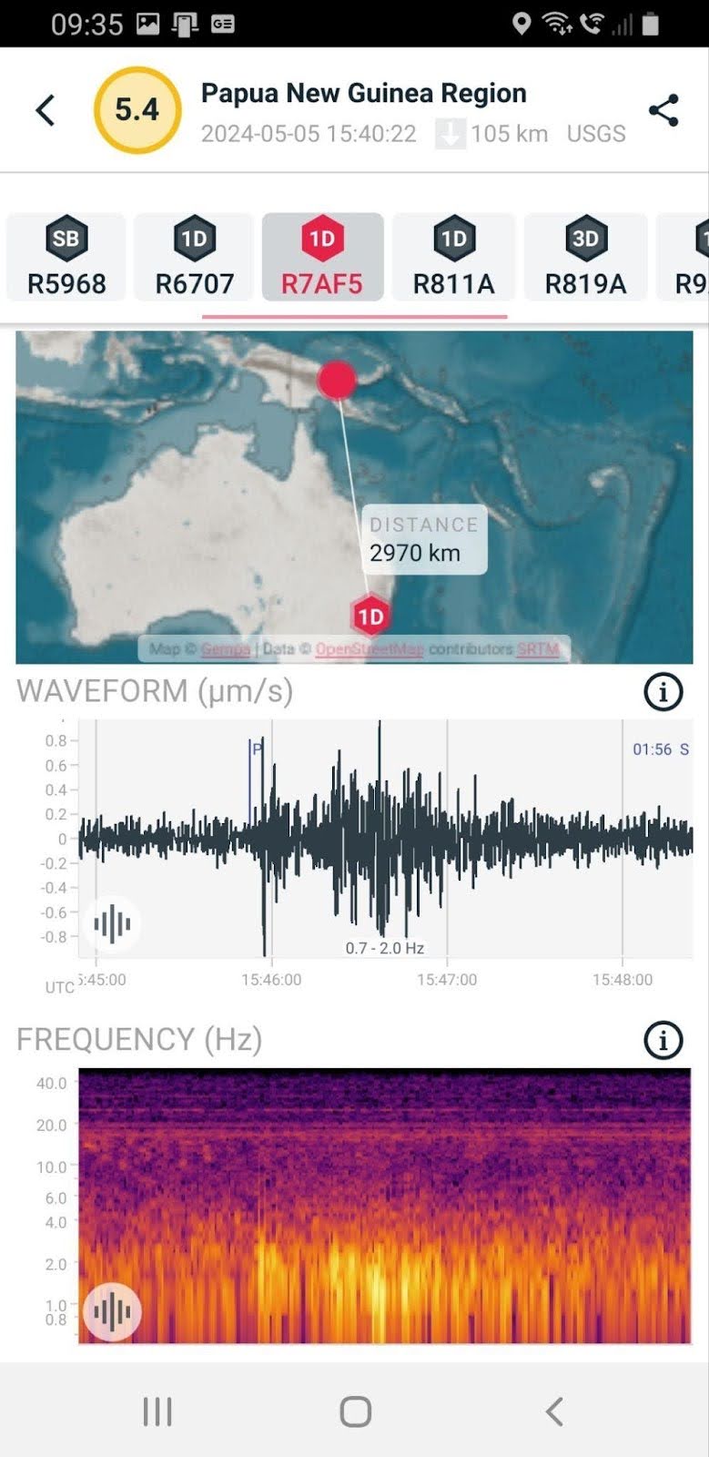 That earthquake was nearly 8,000 km away. If the timing and profile match a large event and the signal is strong enough at your Shake, the Data View software conveniently tags it for you.